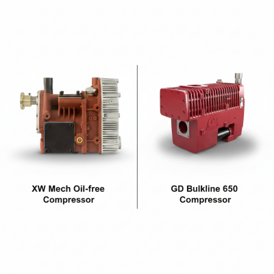 Safety and ease of maintenance are also crucial factors. They not only maximize operational compliance but also ensure safe and long-term operations. Both the XW and GD Bulkline 650 compressor feature an oil-free design, eliminating the risk of oil contamination of the air during operation and significantly ensuring air purity, making them ideal for food, chemical, and pharmaceutical applications. The Bulkline 650 compressor utilizes standard maintenance procedures to simplify operation, while the XW Mech goes a step further, simplifying its architecture by reducing moving parts. This reduces the frequency of inspections and parts replacement, speeding up repairs.